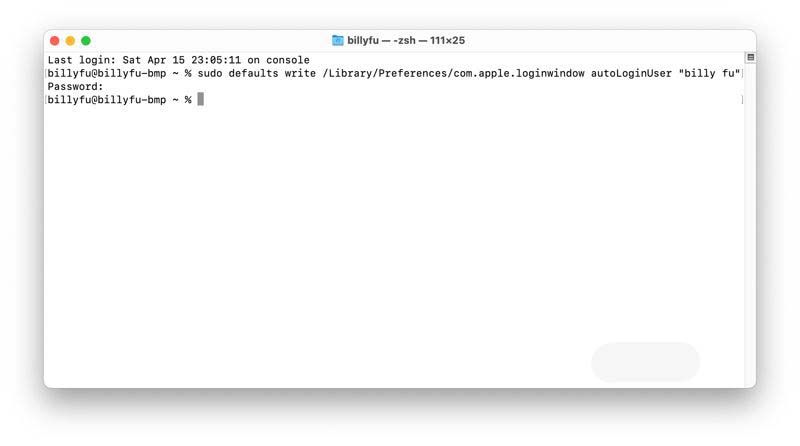 要使用「终端」命令为特定用户账户启用自动登录,请按照以下步骤操作: