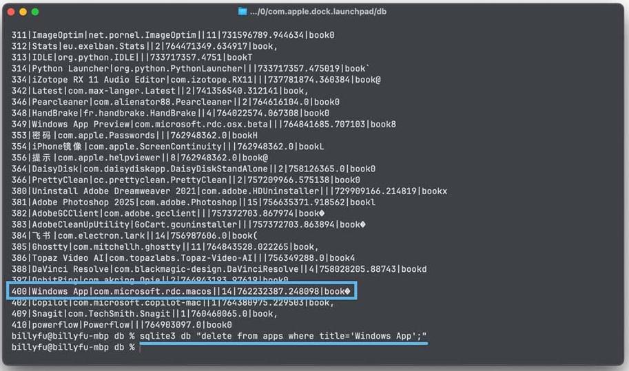 Launchpad 数据库是一个未加密的 Sqlite 数据库,我们可以从数据库中删除不需要的条目,来手动清除顽固 App 图标: