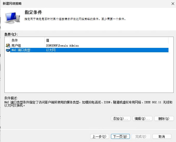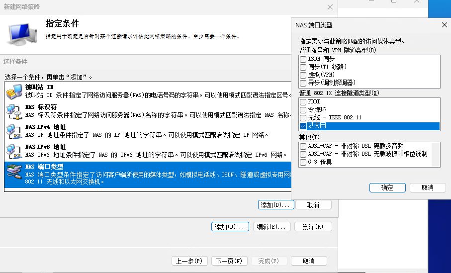 添加条件 - 选择 NAS端口类型 - 选择 以太网(有线) - 确认添加 - 下一页