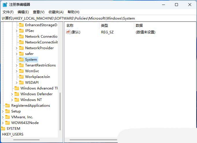 2、注册表编辑器窗口中,依次展开到以下路径:HKEY_LOCAL_MACHINESOFTWAREPoliciesMicrosoftWindowsSystem
