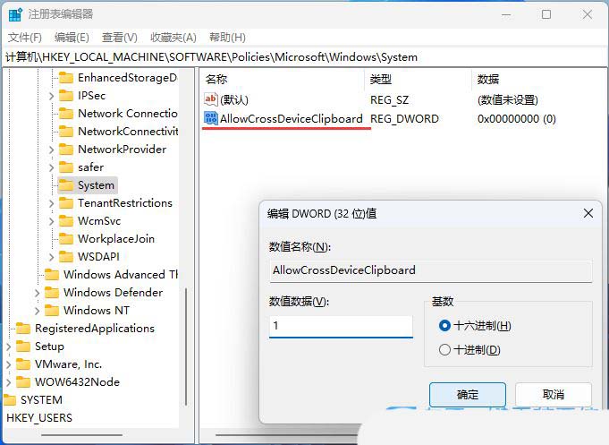 3、新建一个名为【AllowCrossDeviceClipboard】的【DWORD (32 位)】值,并将其十六进制值设置为【1】;