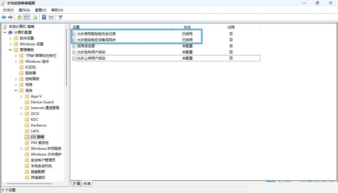 展开到以下路径【计算机配置 - 管理模板 - 系统 - OS 策略】,在右侧窗口中将【允许使用剪贴板历史记录】和【允许剪贴板在设备间同步】策略设置为【已启用】