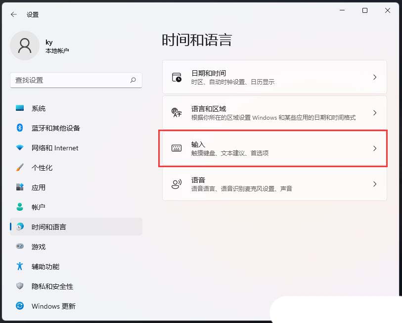 3、右侧,点击【输入(触摸键盘、文本建议、首选项)】;