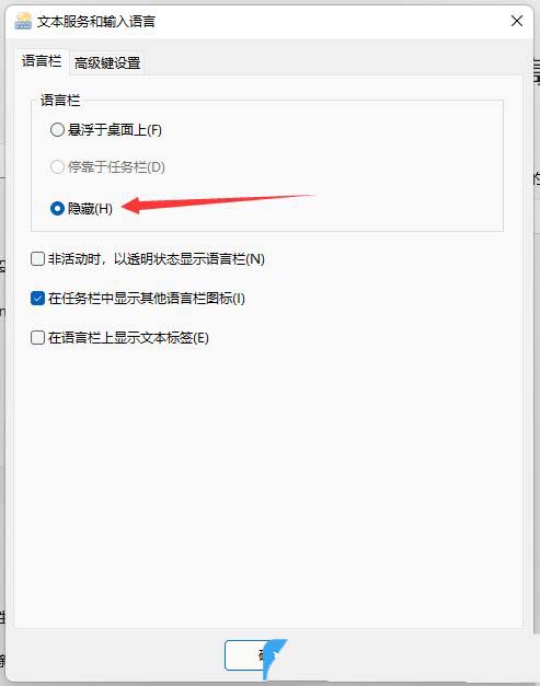 6、文本服务和输入语言窗口,点击语言栏下的【隐藏】;