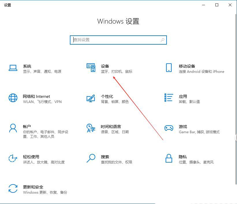 1、首先,按下“ Win+I ”键打开设置界面,点击进入到“设备”设置。