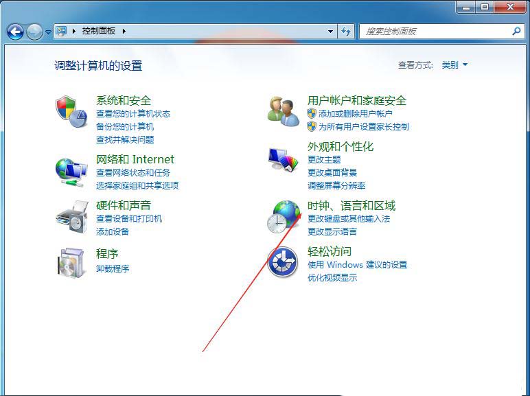 1、首先,打开Win7系统的控制面板界面,点击进入到“时钟、语言和区域”设置。