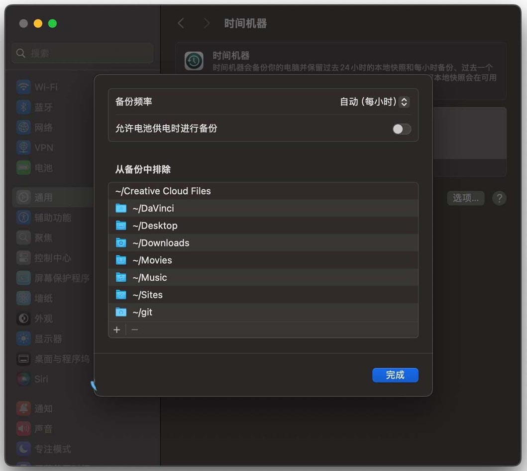 如果你希望调整备份频率或排除某些文件,可以在「时间机器」设置中进行: