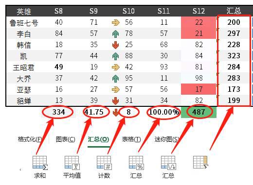 在【快速分析】中,提供了求和、平均、计数、百分比汇总、行求和。懂得这个就不用写比长长的公式,直接选择就能求和等运算。