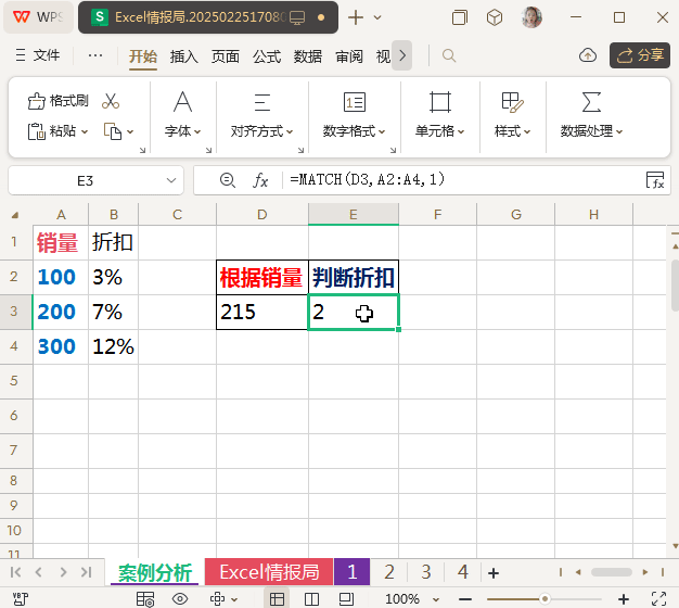 以D3单元格的销量“215”举例,查找值“215”在A2:A4中不存在,则会返回小于等于215的最大值(销量200)所在的行为“2”。