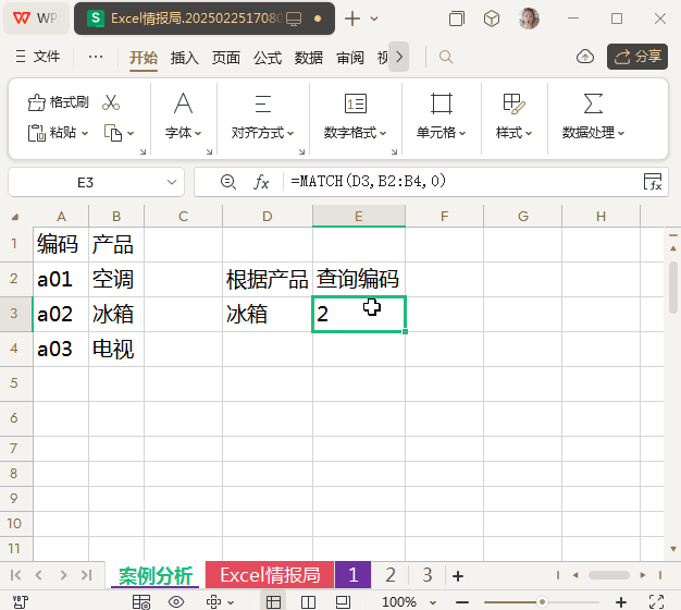 用MATCH函数查找D3单元格“冰箱”在B2:B4区域的精准位置为2。