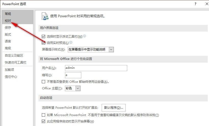 4、第四步,进入PowerPoint选项页面之后,我们在左侧列表中点击打开“校对”选项