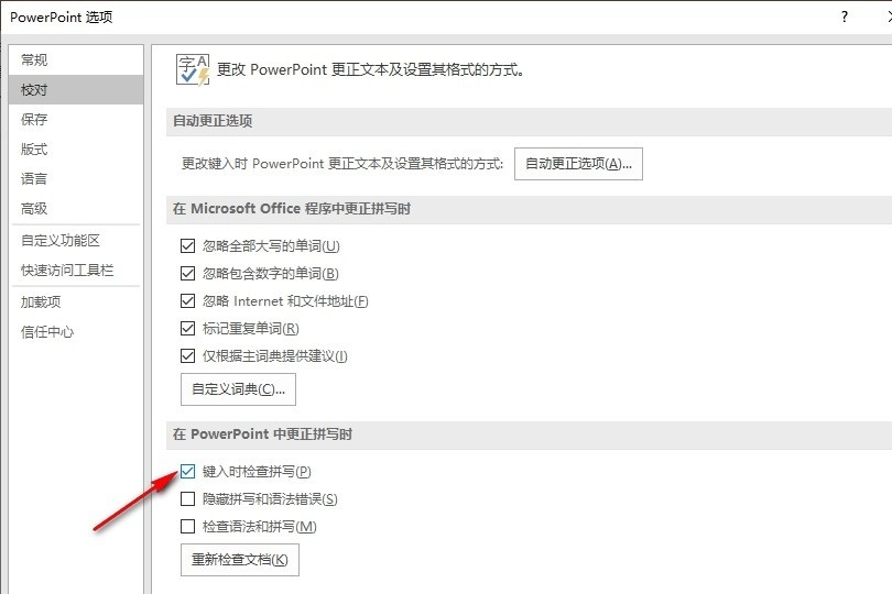 以上就是小编整理总结出的关于PPT幻灯片设置键入时检查拼写的方法,我们进入PPT的PowerPoint选项页面,然后在该页面中点击打开校对设置,接着在校对设置页面中再点击勾选“键入时检查拼写”选项,最后点击确定选项即可,感兴趣的小伙伴快去试试吧。