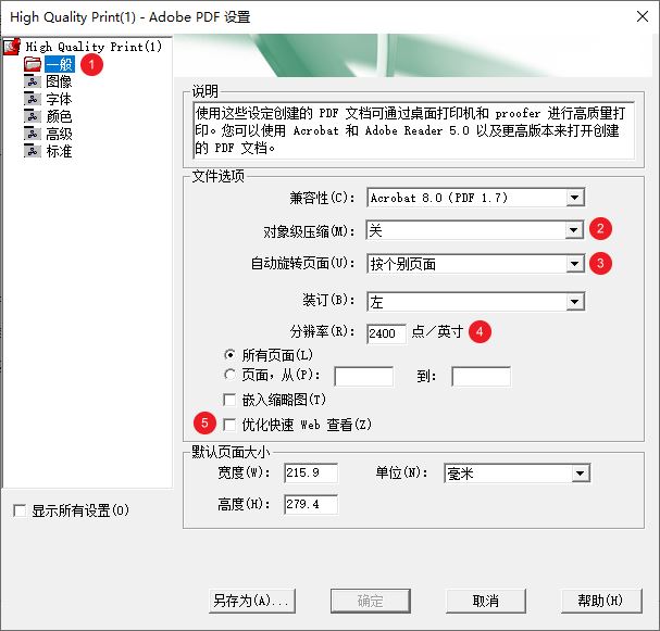 关掉对象级压缩,设置打印时页面自动旋转,提高打印分辨率并取消勾选“优化快速 Web 查看”。