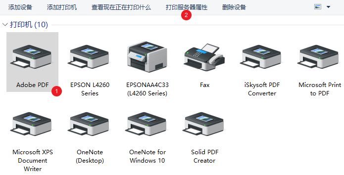 也可以在“设备和打印机”文件夹中,随便选择一个打印机,然后点击上方的“打印服务器属性”: