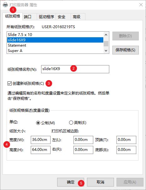 在弹出的窗口中创建新纸张规格,修改宽高并重命名,最后点确定保存: