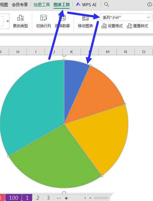 我们插入的图表,后期可能存在多层,我们选中哪层图表,图表工具下的名称框就显示哪层图表的名称,比如我们刚刚插入的第一层饼图名称为:系列“小计”。