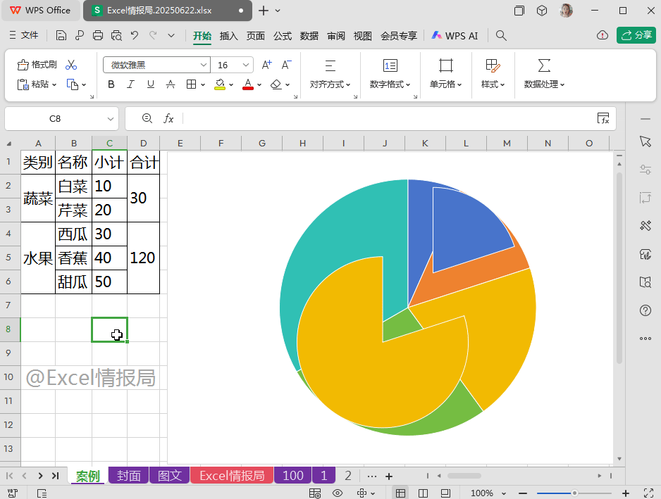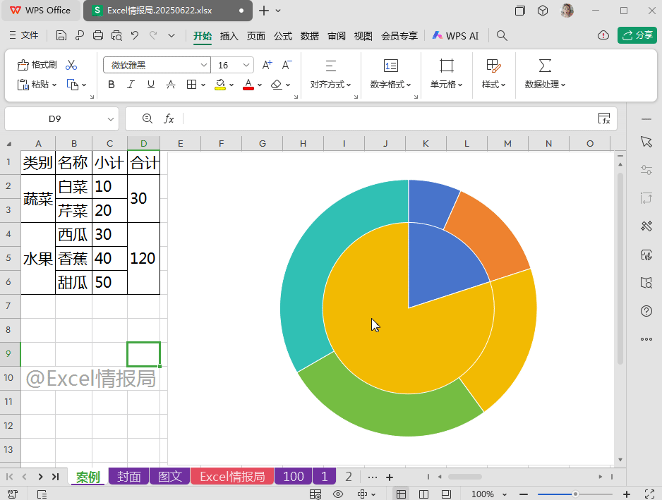 在实际工作中,经常需要制作图表,尤其是饼图一类的,那你知道如何用Excel制作双层饼图让内容层次关系一目了然呢?详细请看下文介绍。答疑解惑SOS:如何做一个双层饼图?如下图所示: ①一级分类:包括“蔬菜+合计30”,二级