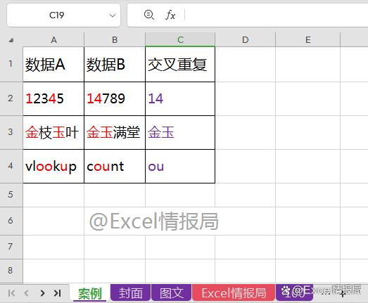 比如A2与B2单元格中都存在“1”与“4”,故在C2单元格中显示交叉重复值:“14”。