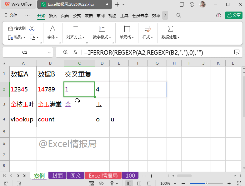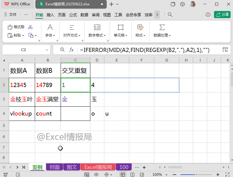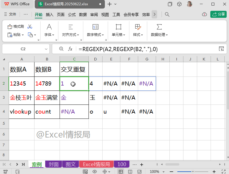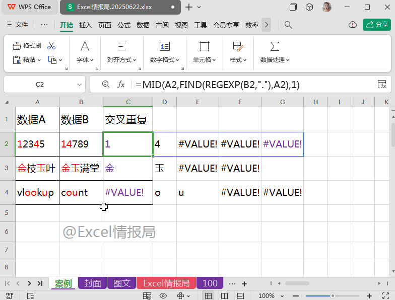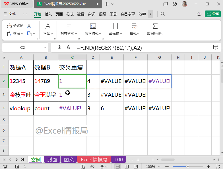 我们将上一步REGEXP提取到B2单元格的每个字符在A2单元格内容中进行查找,如果出现过,则被提取显示出来;没有出现过的,则显示成错误值。