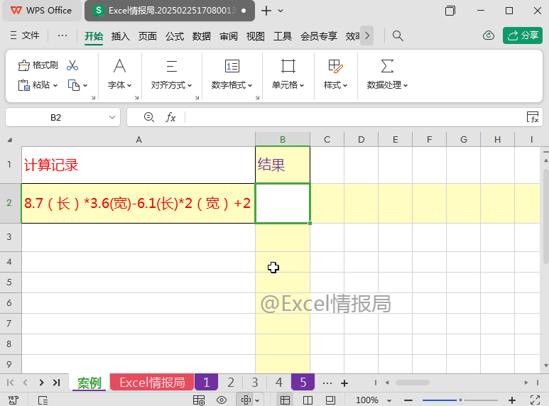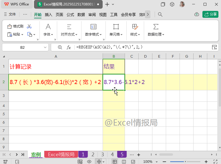 A2单元格是计算过程的记录:8.7(长)*3.6(宽)-6.1(长)*2(宽)+2,不仅含有原始的文本核心算式:8.7*3.6-6.1*2+2,并且在数字后面还标注了带括号的长或宽的信息。并且括号格式还不一致,有些是中文全角的,有些是英文半角的,这些特殊处理细节都对B2单元格的计算结果增加了难度。