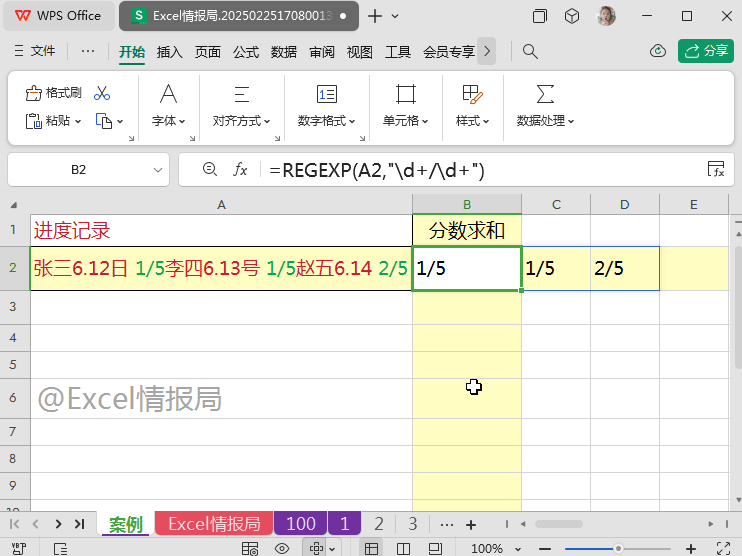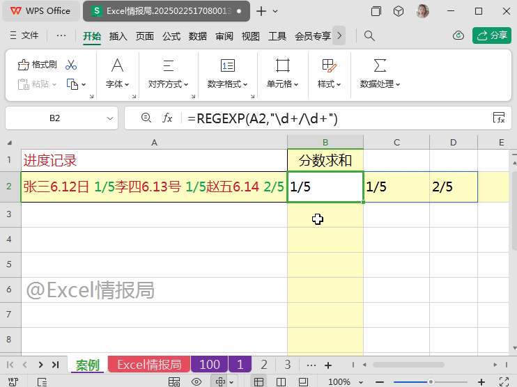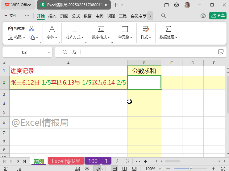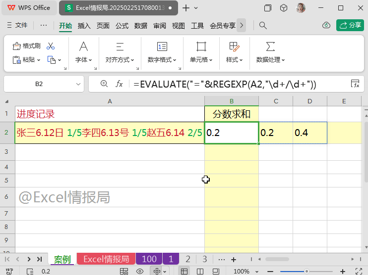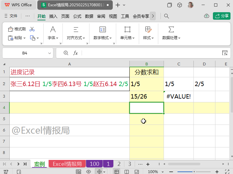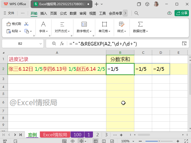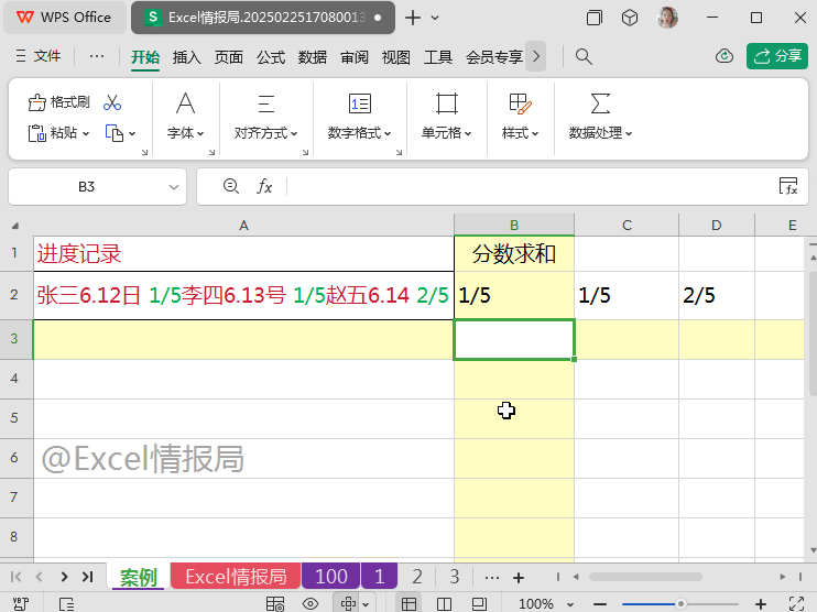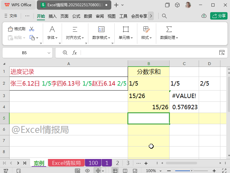 WPS Excel表格中对混合内容中的分数求和的技巧