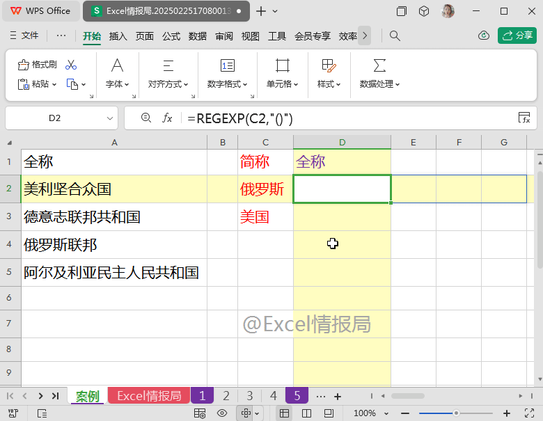 我们用一个例子,来做说明。如下图所示:A列是某些国家的全称,也就是数据源。C列是已知的国家名称的简称,我们想要通过C列的简称,将A列中对应的全称查找出来,显示在D列。