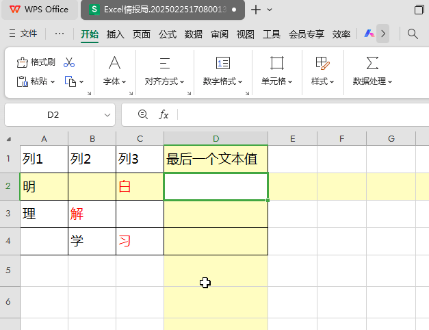 如下图所示,我们会找到每行中最后一个非空文本值。