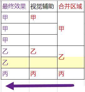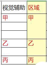 比如,我们在条件“区域”列的左侧插入一个“视觉辅助”列。完整复制F列的数据粘贴到E列。对E列含合并单元格的区域进行“取消合并单元格”的操作,如下图那样。