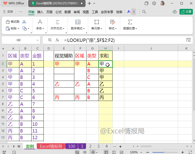 - H2→LOOKUP("座",$F$2:F2)→最后一个文本“甲”