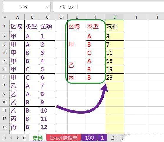 A1:C13区域为数据源区域。A列表示“区域”,B列表示“类型”,C列表示“金额”。每行为一组数据。我们想要根据E列已知的“区域”条件1,与F列已知的“类型”条件2,在G列进行一个金额的条件求和统计。注意:E列含有合并单元格。