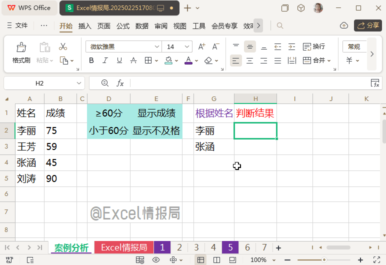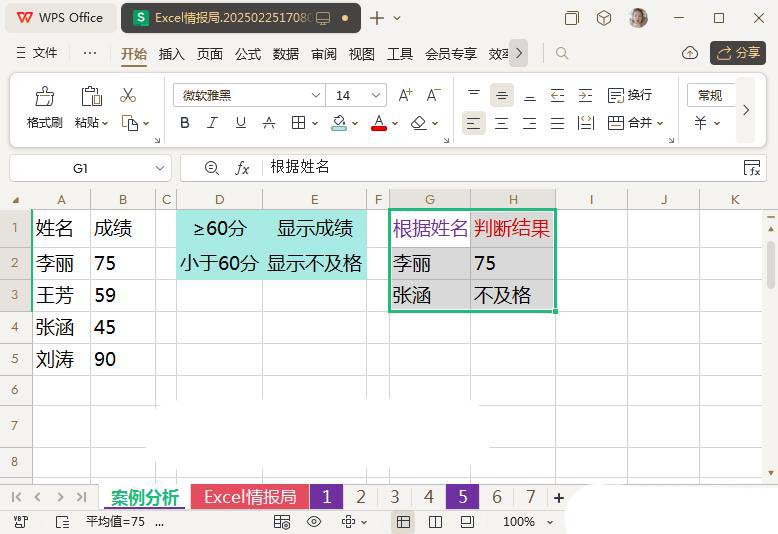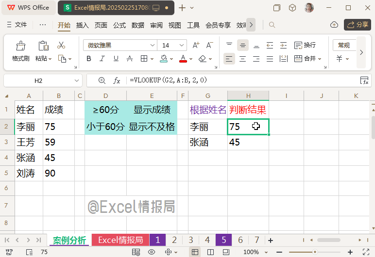 A:B列是数据源区域,为姓名与成绩对照表。我们想要在H列显示判断结果:当G列的姓名所对应的成绩大于等于60分时,显示其成绩,当G列的姓名所对应的成绩小于60分时,显示“不及格”。