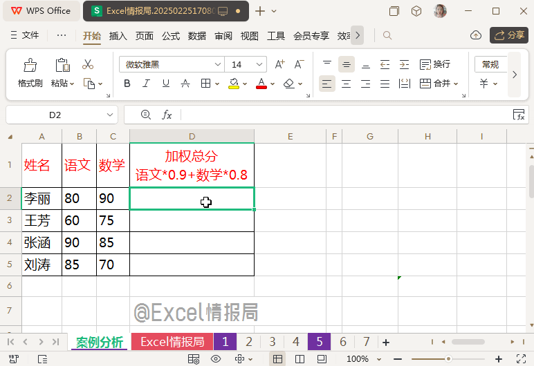 例如A1:C5区域为学生成绩表,B列为语文成绩,C列为数学成绩,我们想要在D列统计加权后的总成绩,加权规则为:语文*0.9+数学*0.8