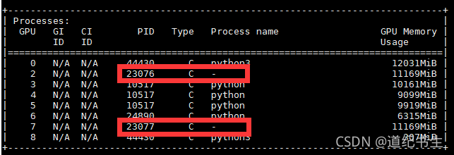 PID为32076及32077的僵尸进程占用了大量GPU资源,通过sudo kill -9 XXX 指令杀掉进程。