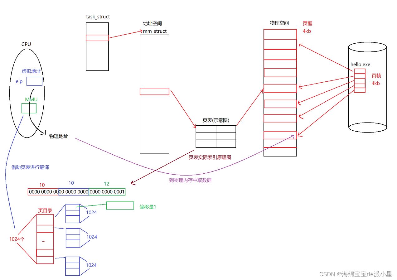 借助这样的结构,就可以使得整个页表的体积大大减小,但是更为重要的是,此时找到的就是物理内存中的页框了,但是在平时进行访问的时候其实并不关心页框,关心的是页框中的某一个数据,但是只需要借助最后的偏移量就可以找到了,只需要由前10个比特位找到页目录,然后再通过下标找到对应的页表,再通过中间的10个比特位找到对应的页表项,再通过页表项的内容找到页框,再通过最后的这个偏移量来找到所需要的数据内容