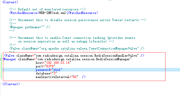 3,配置redis的session共享,同时修改E:\apache-tomcat-7.0.6\conf\context.xml、E:\apache-tomcat-7.0.7\conf\context.xml文件,在context节点中增加红圈中的部分。