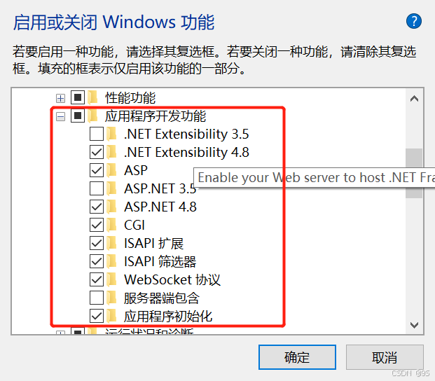 internet信息服务(勾选),web管理工具(全选),万维网服务(勾选),功能程序开发(全选)。