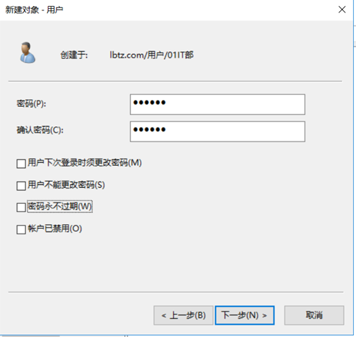 4、在IT部下,新建用户zhangsan。选择新建>用户。这里就不是组织单位了,这里创建用户。输入用户名、登录名等信息。下一步>输入密码,下面的选项全都不选。 下一步,完成创建。