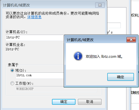 此电脑,右键属性>更改设置>计算机名-更改>隶属于-域。注意windows家庭版好像不能加入域。域名输入我们上面创建的那个域名我这里是lbtz.com