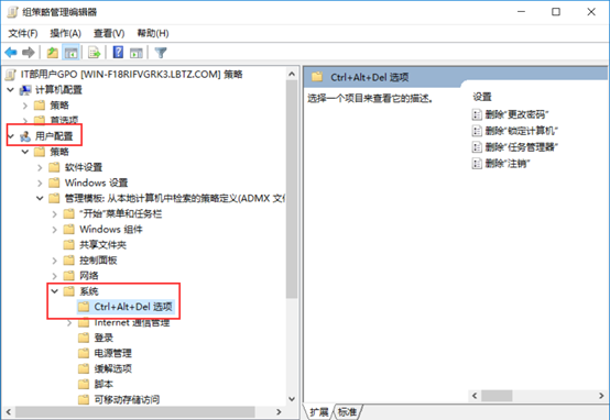 5、使用组策略功能,禁用任务管理器功能依次展示组策略的用户配置–>策略–>管理模板–>系统–>Ctrl+Alt+Del 选项
