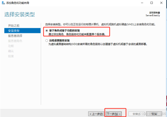3、在“安装类型”上,选择“基于角色或基于功能的安装”,然后点击“下一步”;