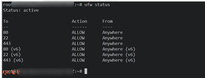 防火墙启动后运行 ufw status,就会看到防火墙的状态为活跃状态 Status: active