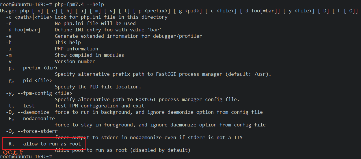 修改之后,还有一个地方需要修改,通过 help 可以看到,php-fpm 默认是不支持 root 启动的,需要以 R 参数启动