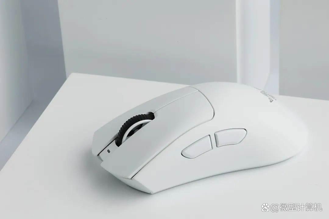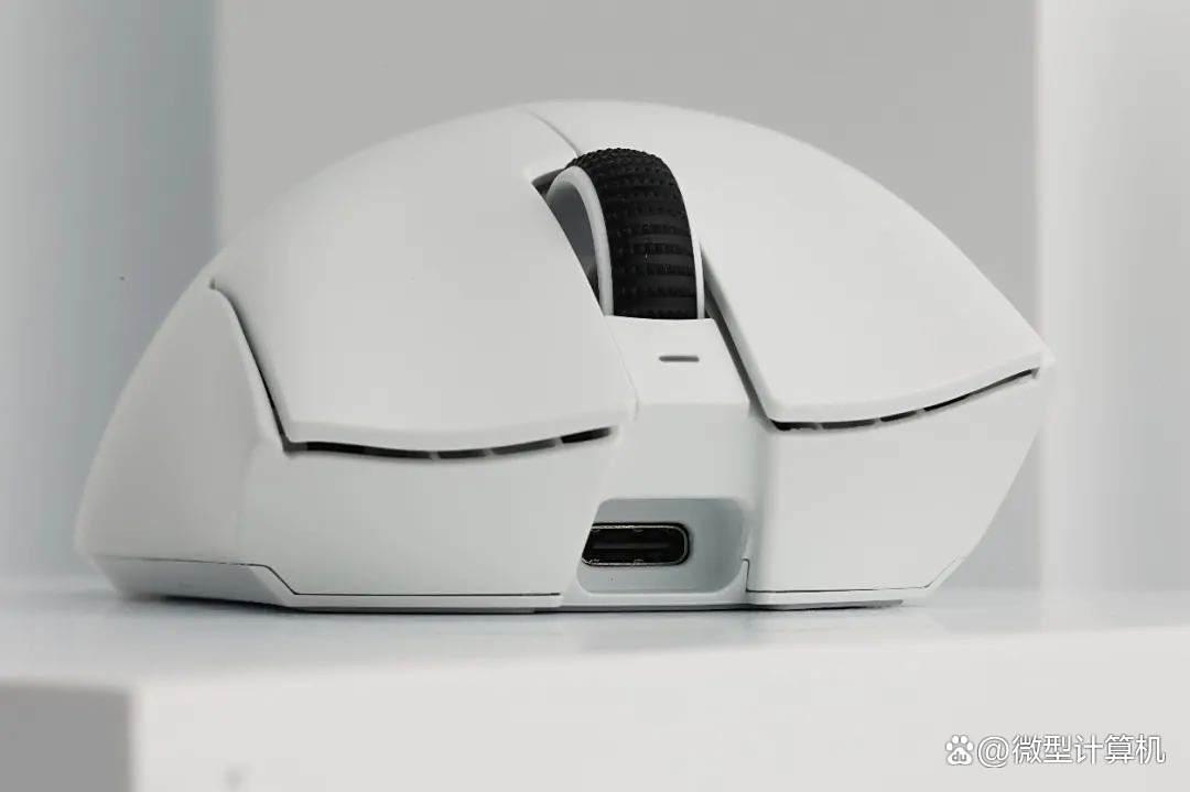 配色上,雷蛇炼狱蝰蛇V4专业版无线游戏鼠标提供了纯黑色与纯白色两款可供选择,我们评测的是后者。坦白地说,白色是所有颜色中最易沾染污渍的。然而,雷蛇炼狱蝰蛇V4专业版无线游戏鼠标那经过处理的硬塑料上盖具备显著的颗粒感触感,同时拥有耐磨、耐脏的特性,故而能够在长时间使用后仍保持洁净状态。仔细查看这款鼠标,我们能够看到雷蛇炼狱蝰蛇V4专业版无线游戏鼠标的左右部位仍沿用分体式设计。其后背处所印刻的标识虽不具备背光效果,但在洁白的机身之上颇为醒目。与此同时,该鼠标的正面中心位置设置了USB - C接口,用于补充电量;鼠标滚轮前方留存有一个指示灯,以辅助用户判断当前鼠标的CPI挡位。