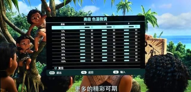 笔者还发现了一个有意思的细节,那就是W4100i给了11档色温调节(每档步进25K),专业的投影才有的底气给到这么细,这波操作让用户有了二次创作的空间。但更牛的是,它能保证全色域下灰度偏差始终控制在ΔE<1.5,不像普通投影调完色就偏色。实测《海洋奇缘2》时,100%色温和5%色温下,色彩准确度没啥变化,就是100%时人物皮肤更红润,5%时更清淡。