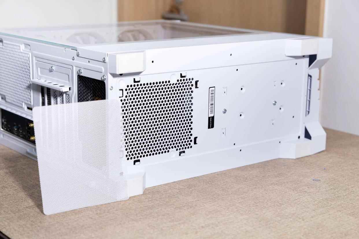 机箱底部采用了半包围式的脚撑设计,体积大,支撑稳定。对应电源进风口,还提供了可拆卸式的防尘网进行保护。