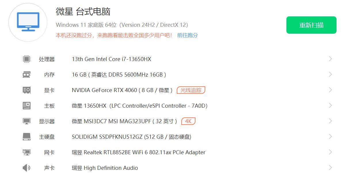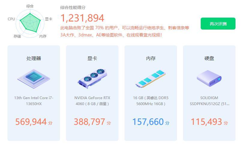 Intel 酷睿 i7 13650HX和微星4060万图师的组合,在鲁大师的跑分中,轻松拿下123W的综合得分。