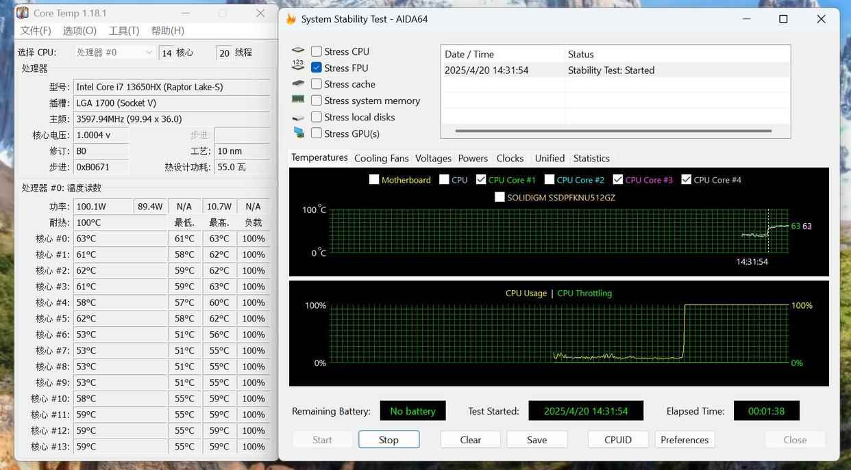 这里对处理器进行FPU烤机测试,在满负荷压力测试下,这枚Intel 酷睿 i7 13650HX处理器的温度可以稳定在63℃。并且温度波动也非常平缓,通过检测软件可以看到处理器的默认功耗为55W,最大功耗为100W。优秀的主板供电和6热管高效风冷散热器显然可以轻松压制处理器的温度。
