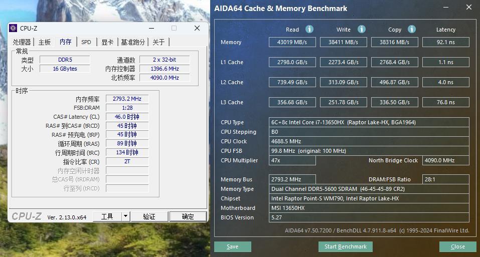内存为单根16G,频率为5600MHz,测试读写速度为43019MB/s,38411MB/s,延时92ns,工作时序锁定在CL46-45-45-89。玩家后期升级双通道,可以进一步提升性能表现。