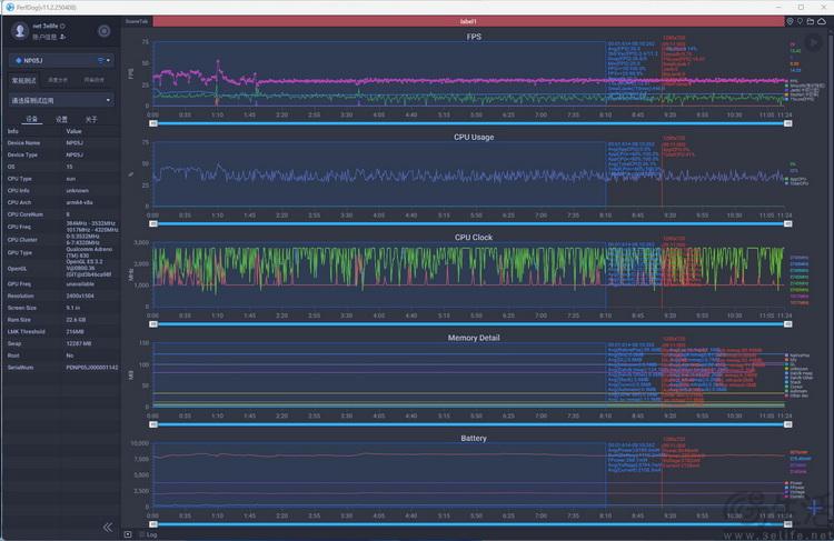 进一步加大压力,我们使用《鸣潮》的最高画质设定来考验红魔电竞平板3 PRO。 需要注意的是,《鸣潮》现在似乎对红魔电竞平板3 PRO已经适配了游戏内置的插帧功能。但为了统一测试条件,这里使用的依然是平板自带的超帧处理。从结果来说,即便是《鸣潮》也并没有为其带来任何压力,开启超帧后,红魔电竞平板3 PRO可以顶着超过9W的平均功耗,将这个游戏跑出稳定的120FPS。