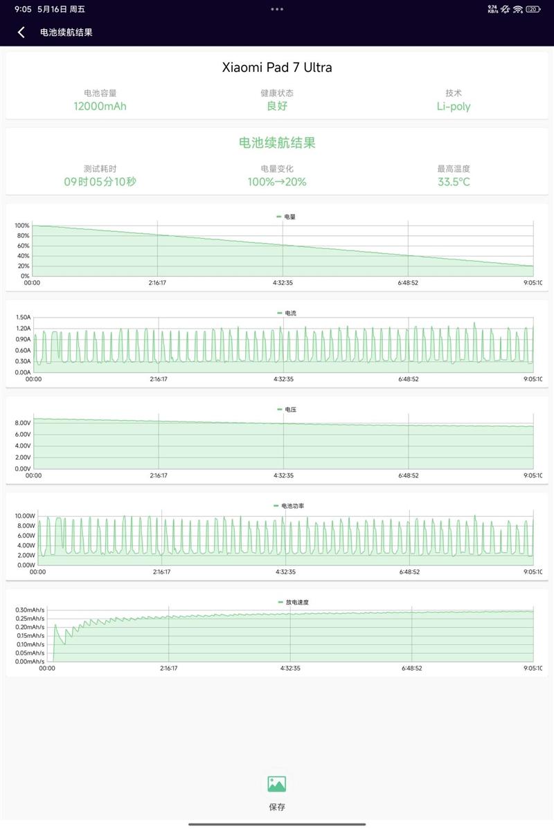 经过电池狗狗实测,Xiaomi Pad 7 Ultra连续运行了9小时05分钟后,电量从一开始的100%降到20%,据此计算平板的综合电池续航超过了11个小时。